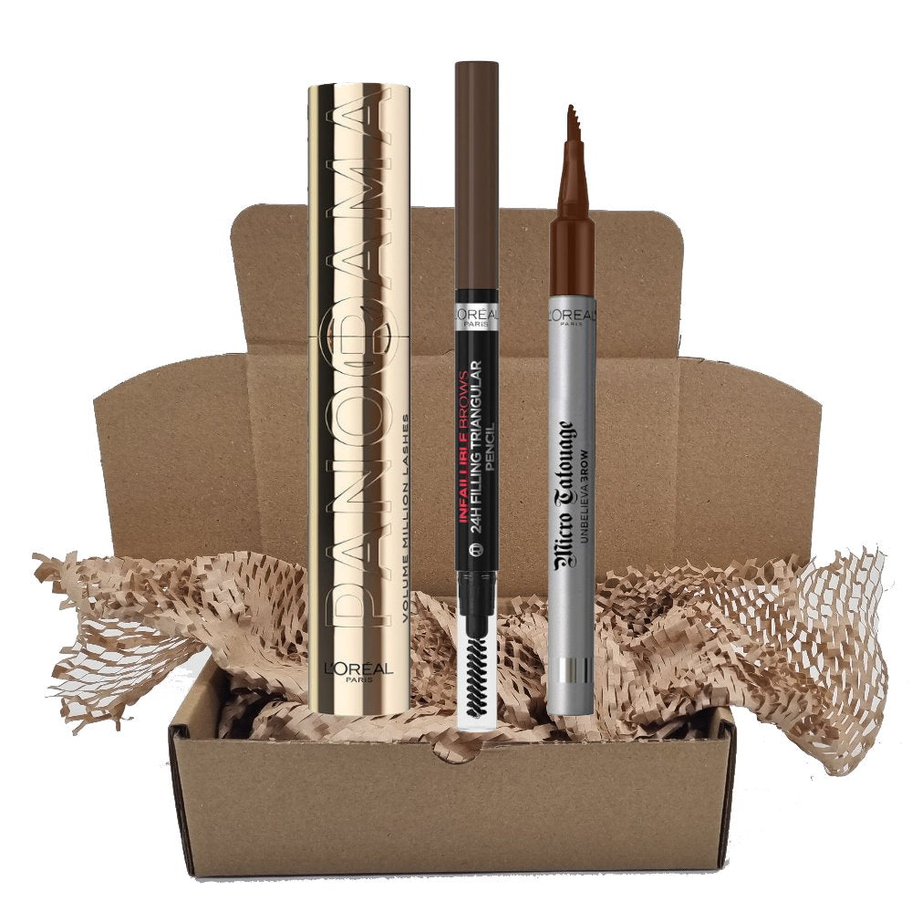 3pk SET LOreal Eyebrow Definer 105 Brunette, Triangular Eyebrow Pencil 3.0 Brunette and Panorama Mascara Black
