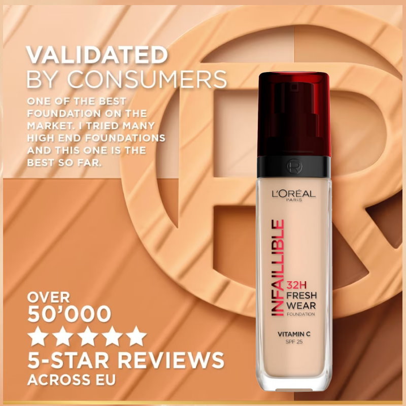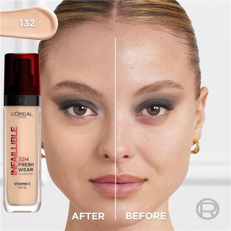 See your skin in its best light yet thanks to the Infallible 32H Fresh Wear Foundation which is both long-lasting and lightweight. L'Oréal Paris presents its most breathable longwear foundation, now formulated with a combination of two powerful ingredients: Vitamin Cg which helps the skin look smoother and brighter in 4 weeks, as well as the light diffusing micro-pearls, making it luminous from the first swipe. Erase your skin's dullness instantly with this long-wear yet lightweight foundation. Designed to last for up to 32hours while still allowing the skin to breathe. A transfer-resistant finish that won’t shift on the skin throughout the day and is resistant against water and sweat. The formula is lightweight with no cakey or heavy feeling and can build to the desired level of coverage. This luminous foundation is available in 24 shades, evenly split between light, medium, and deep tones, so that every skin tone can become flawless, i.e., "Infallible". Our Fresh Wear foundation is designed to be perfect inside and out, featuring a modern and sleek bottle that can be recycled. Indulge in an ultimate skincare and beauty experience, with our buildable, luminous formula that will make your skin feel radiant all day long.