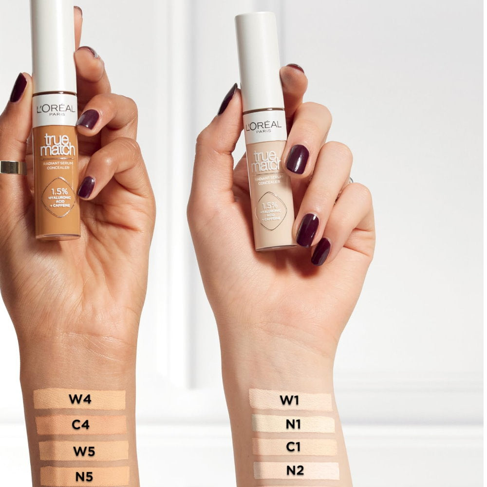 Why just conceal when you can shape and contour your face, while your serum concealer replumps your skin where needed, all at the same time? Discover the new True Match Radiant Serum Concealer by L'Oréal Paris, a multi-purpose under-eye concealer that does it all. Enriched with 1.5% Hyaluronic Acid and a Caffeine complex, this product that combines skincare and makeup to correct like a concealer and hydrate like an eye serum. Gone are the days of compromising between coverage and skincare benefits. A unique iron applicator is designed for precise and even application under the eye or any other target areas across the face. This concealer comes in a range of 12 radiant shades, suitable for a range of skin tones. Elevate your makeup routine and play with multiple shades to achieve your desired makeup look, because True Match is more than just a concealer. Time to complete your flawless makeup routine with: - True Match Tinted Serum Foundation: Our global viral sensation that delivers a radiant skin finish, covering like a foundation while hydrating your skin like a serum. - True Match Powder: A light-textured powder that perfectly matches the colour and texture of your skin to achieve a flawless finish. - True Match Blush: A super-blendable powder blush with a soft texture that goes on smooth with a long-wear formula giving your cheeks a flush of natural colour.