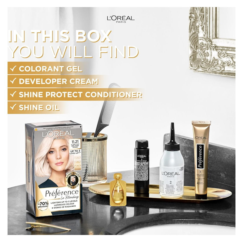 L'Oréal Paris Préférence gives you bold, luminous colour full of reflects, that lasts up to 8 weeks. 100% Grey Coverage. Discover the unique shades of Préférence with light-reflecing dyes for a more luminous colour. The translucent gel formula, associated with the new shine oil, gives your hair a colour with luminous reflects and intensifies the natural nuances of your hair colour. The Shine Protect Conditioner is enriched with a UV filter and Vitamin E to preserve your shine for up to 8 weeks of radiant colour.