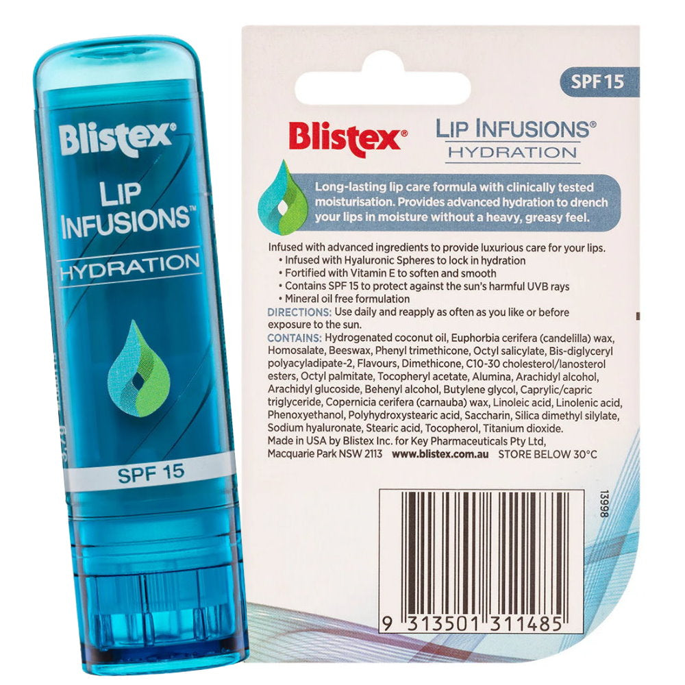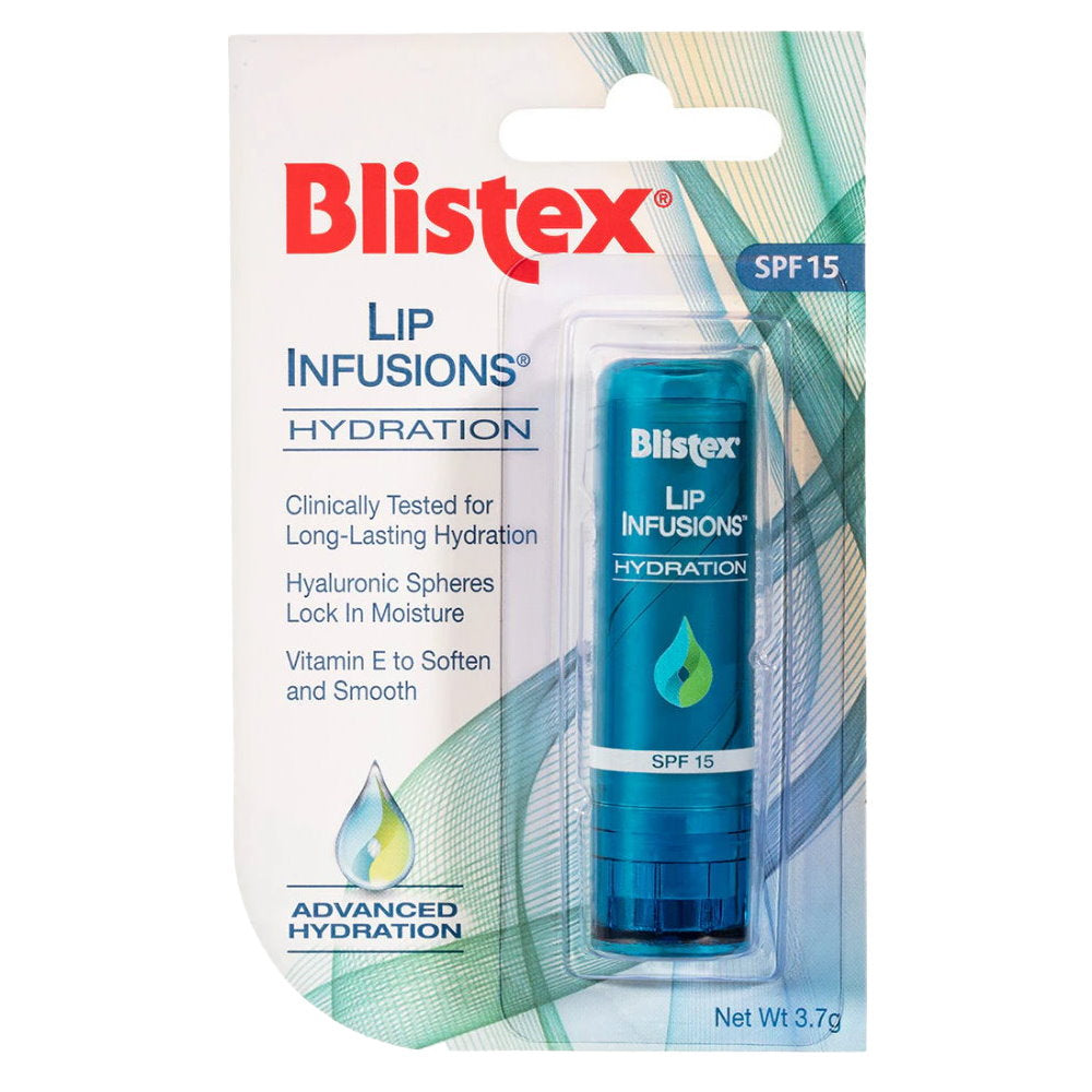 Blistex Lip Infusions Hydration is clinically tested for long-lasting hydration. It's Hyaluronic Spheres lock in moisture, and Vitamin E works to soften and smooth the lips.