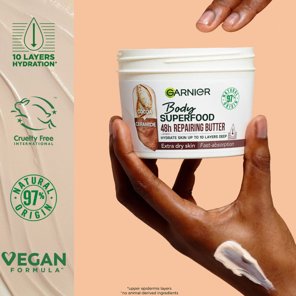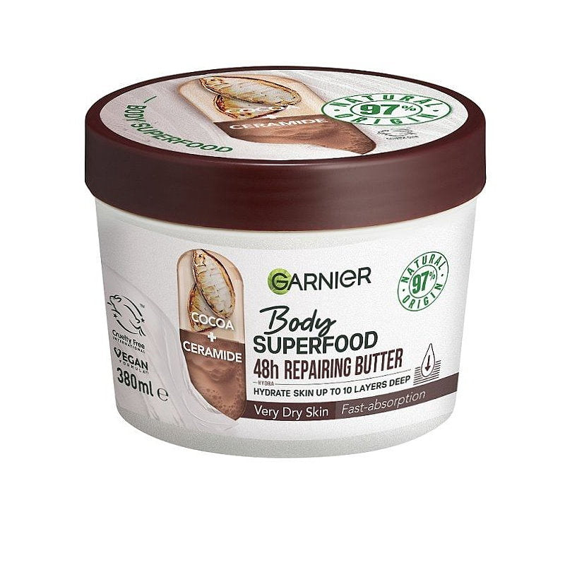 Garnier Body Superfood Cocoa & Ceramide contains ingredients of 97% natural origin. This fast absorbing butter hydrates up to 10 layers deep and provides an up to 48h repairing effect**. For very dry skin types.