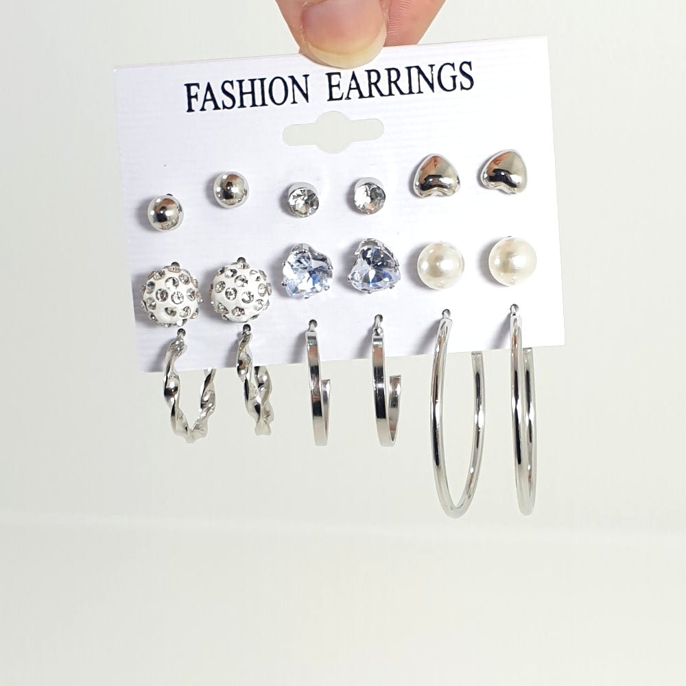 Rosy Lane 9 Pairs Assorted Stud and Hoop Earrings - Silver