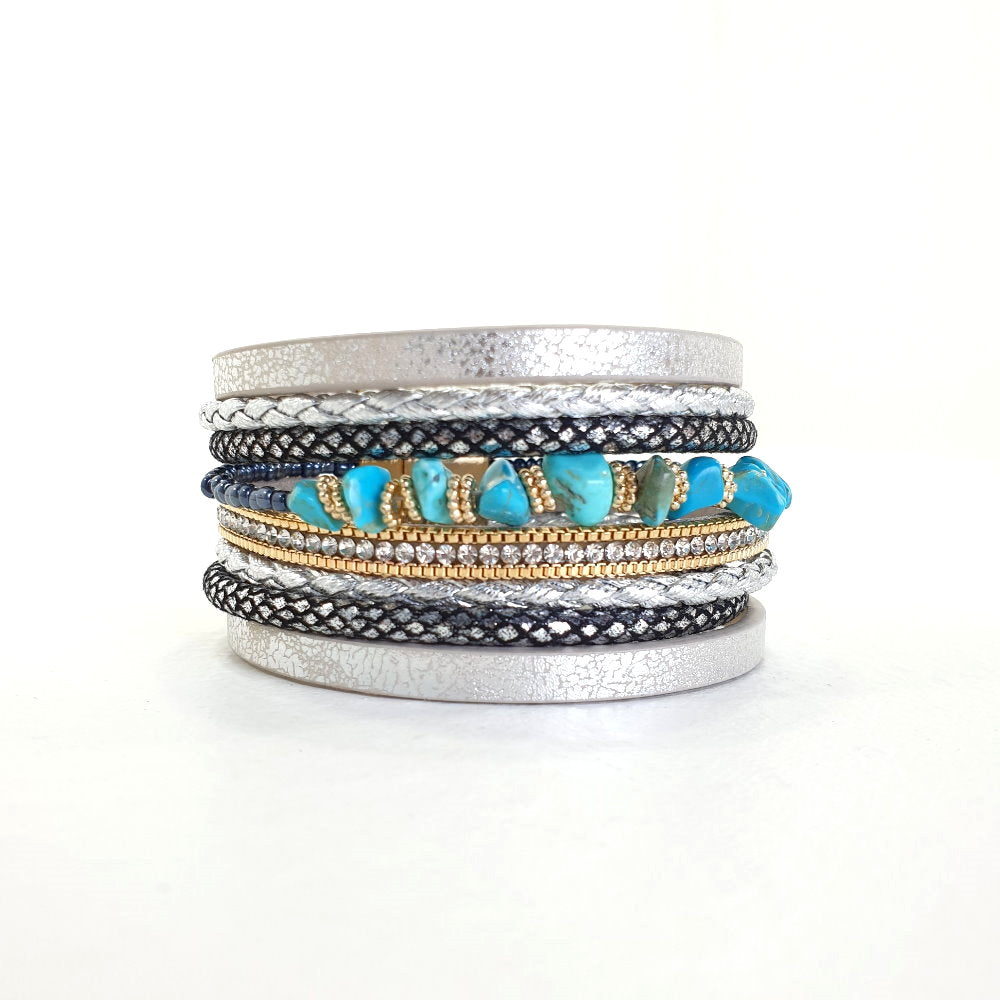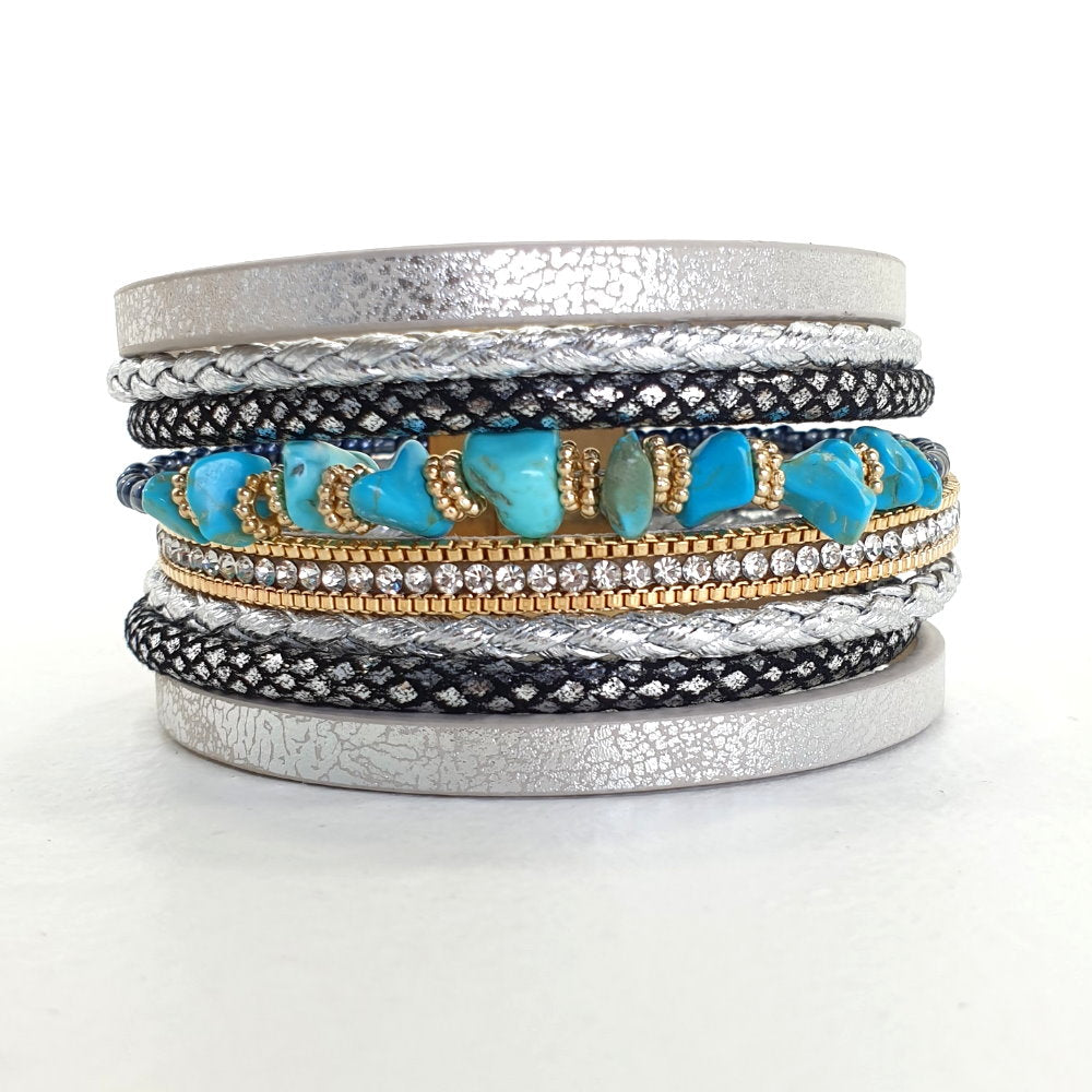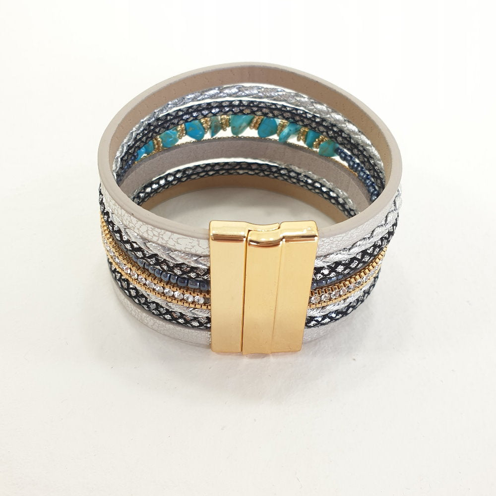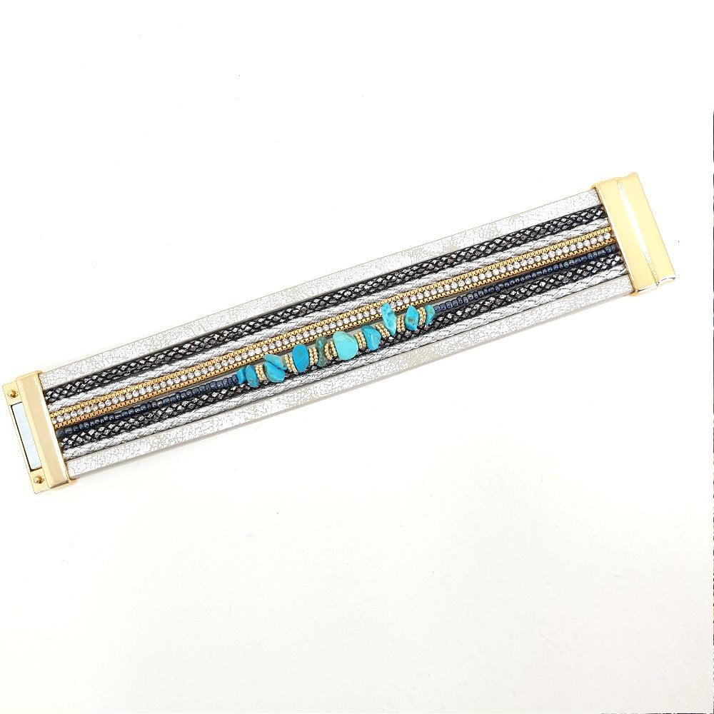This stylish bracelet is the perfect accessory for any occasion. It is crafted with blue stones, snakeskin like-leather, along with a strong magnetic clip. The bracelet will provide a subtle sparkle and secure fit with every wear.