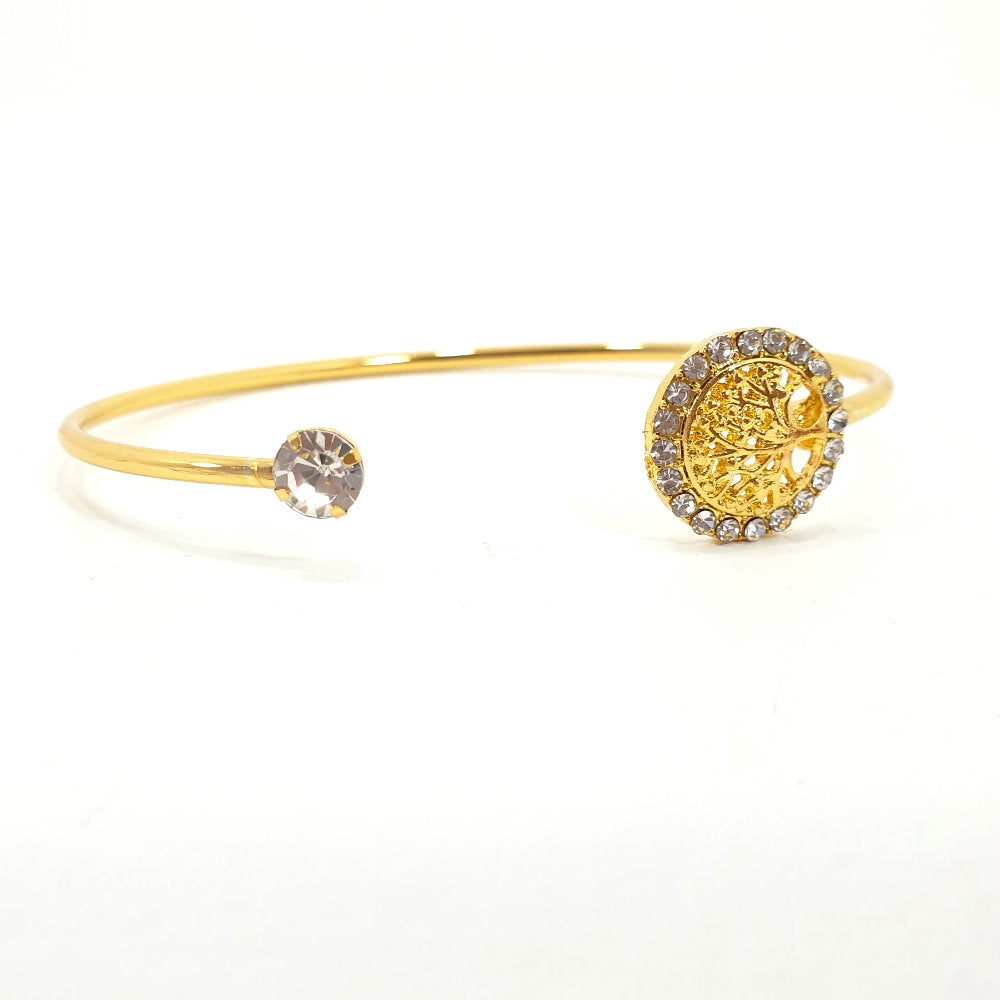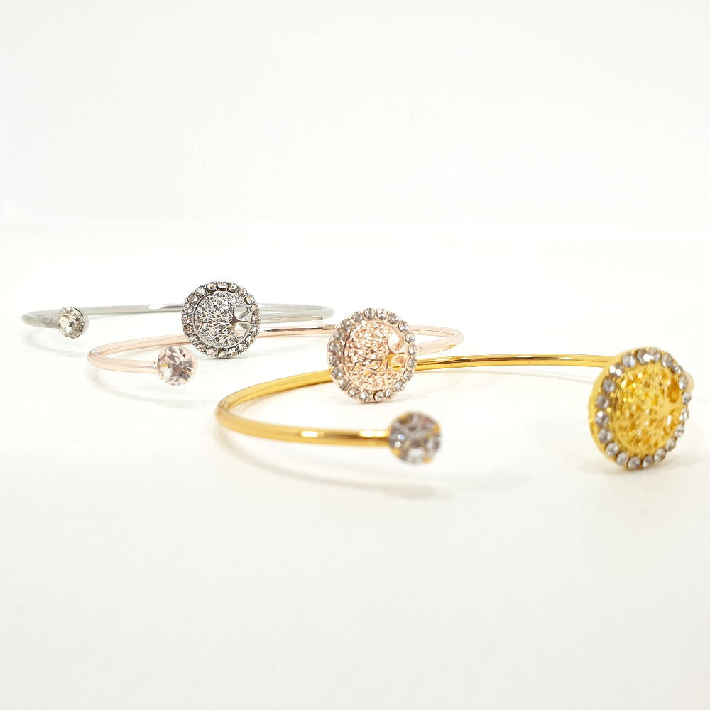 Rosy Lane Tree of Life Bangle in Gold with diamond-like detail spiritual self trendy fashionable The gold exterior sparkles and shines, making you look and feel your best. It's a subtle, yet stylish way to show your spiritual self and make a bold fashion statement.