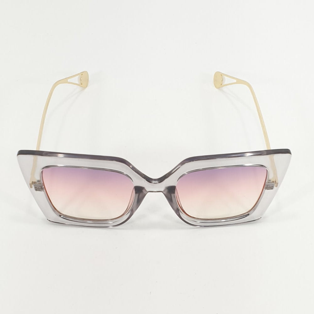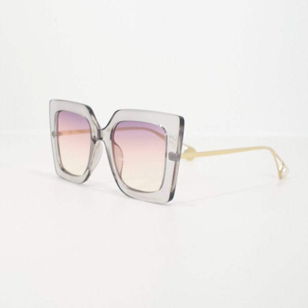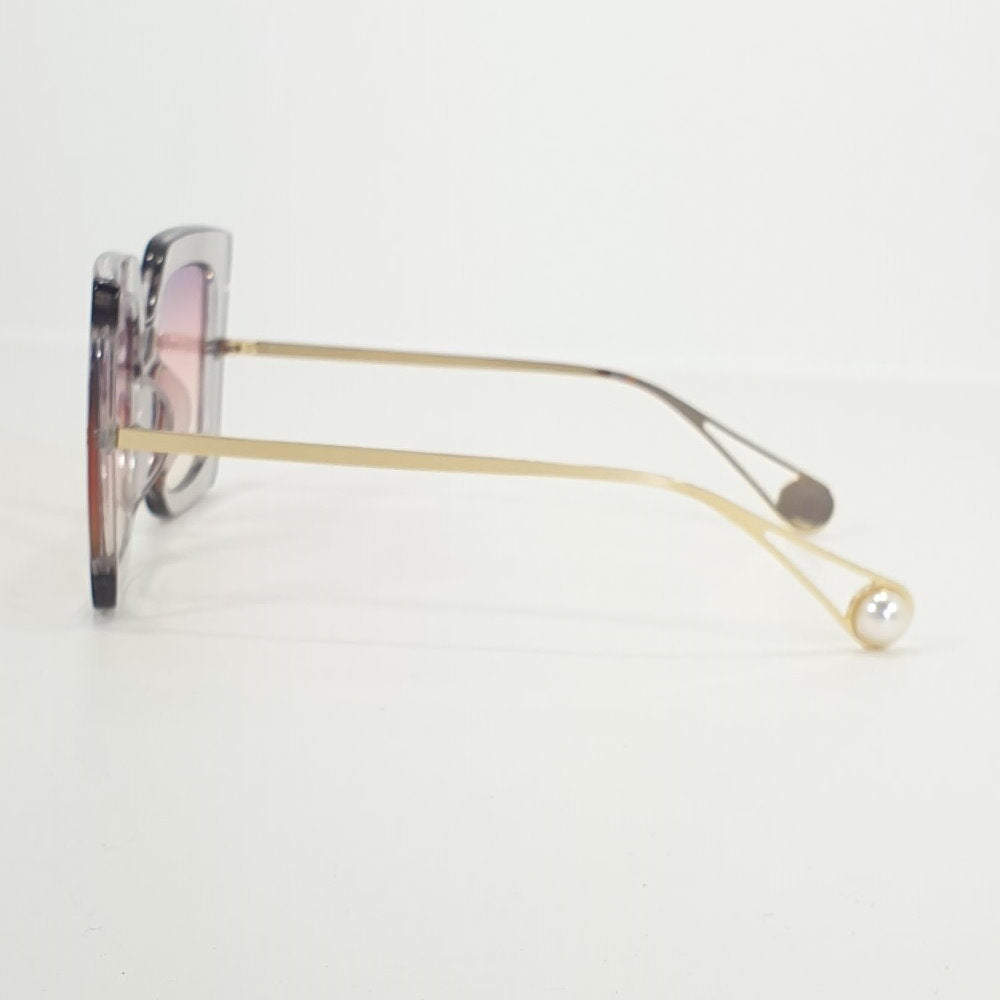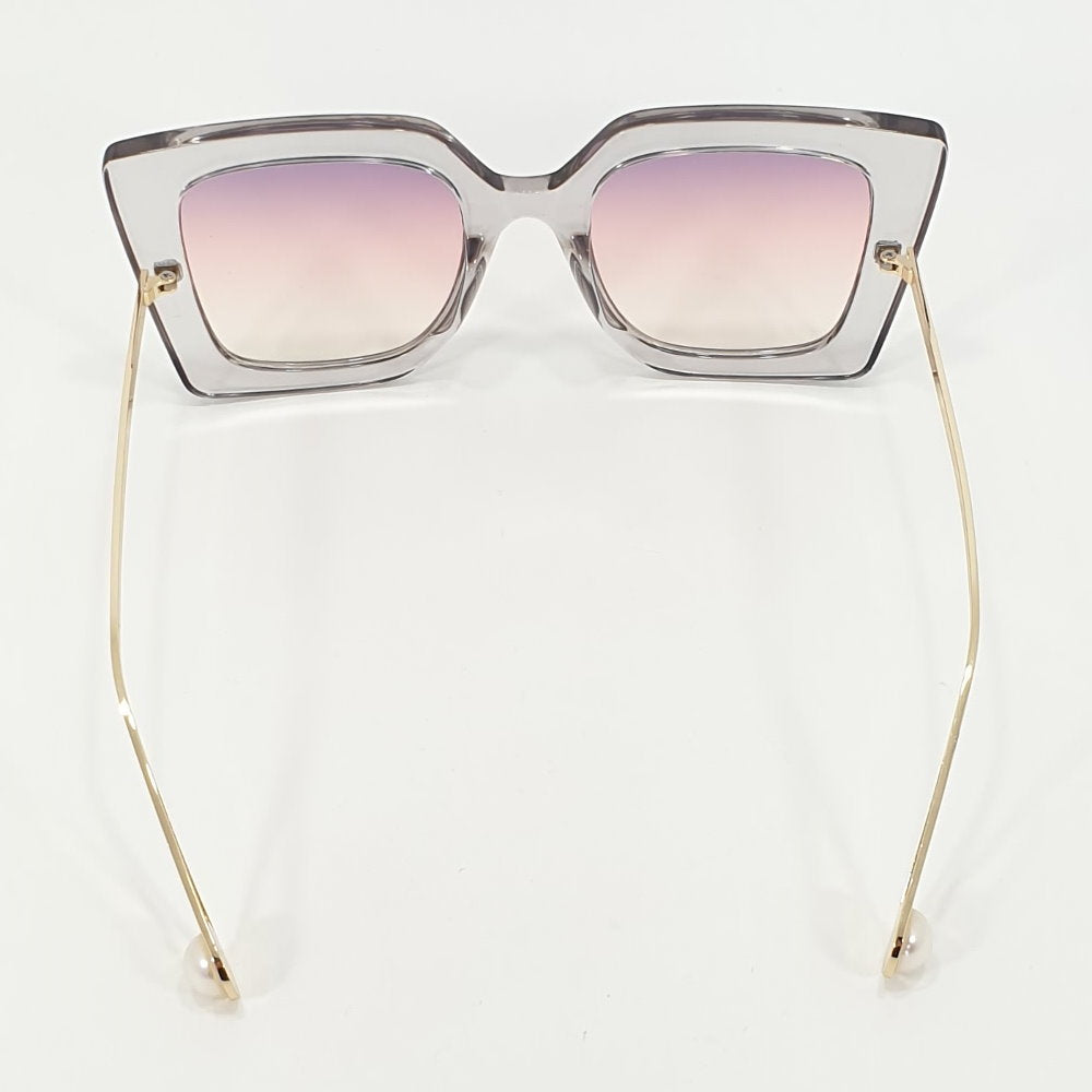This pair of vintage oversized cat eye sunglasses features a clear frame with gold-metal arms and pearl detailing, providing a striking contrast against a gradient lens in shades of purple and pink.